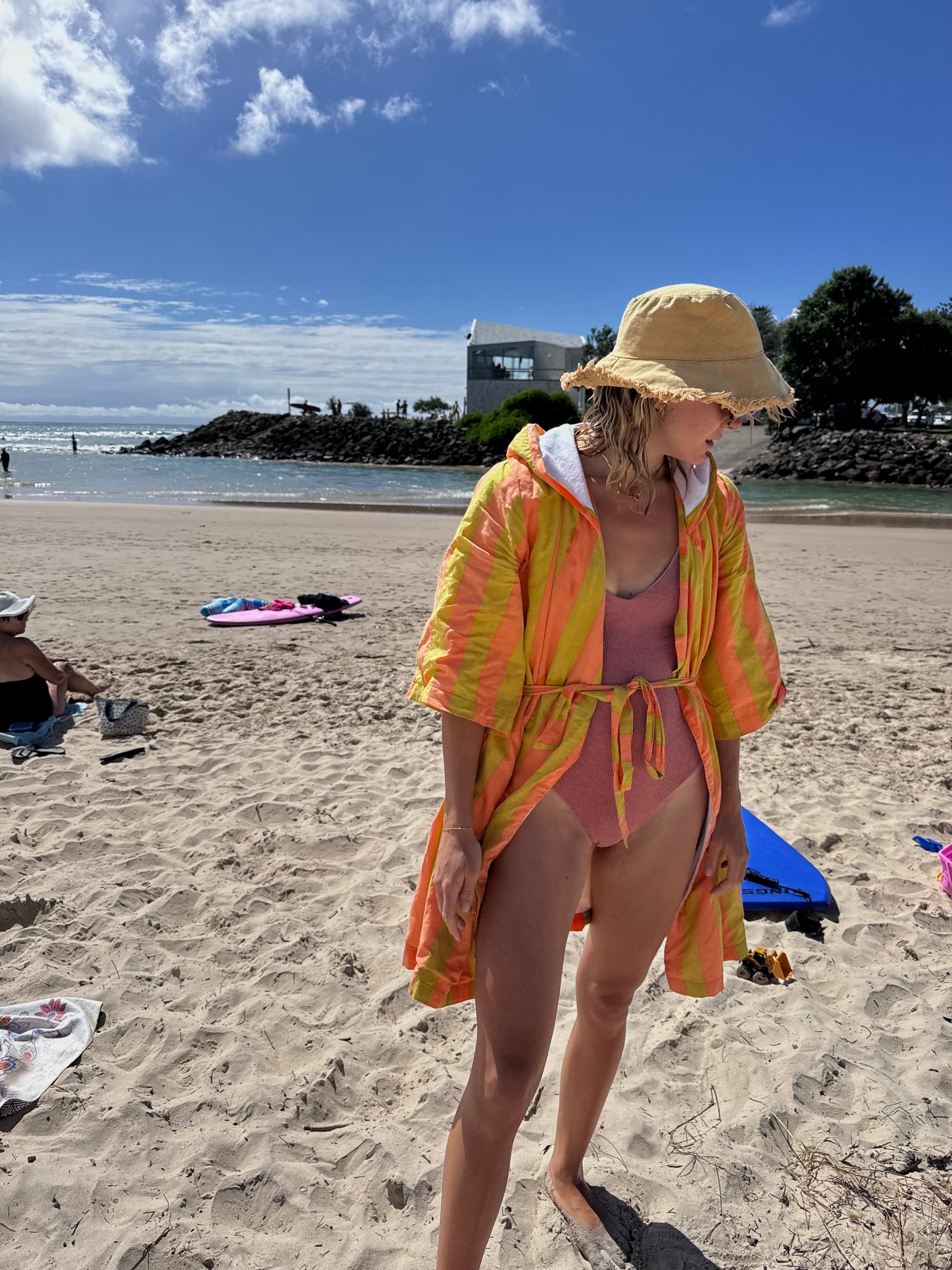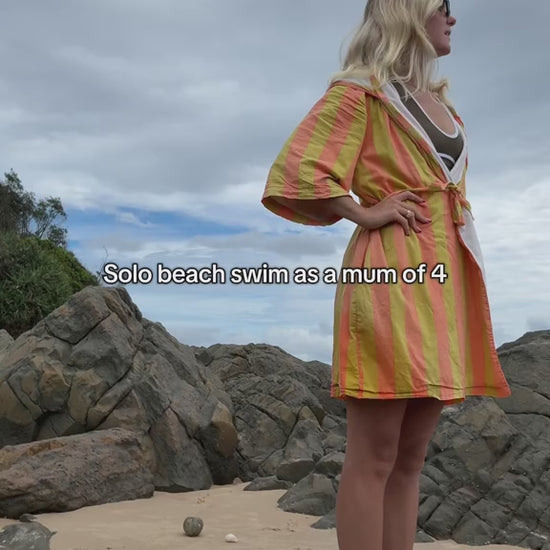 This is our third Women's Beach Robe collection and matches with the new Striped Jumpsuit Towel's. As a Mum of 4 I needed an easier way to go to the Pool & Beach with my kids on my own, so I needed a Towel I can throw on and still have two hands to dry/dress the kids and hold all our belongings! That's where this design comes from, to ensure your beach trips with kids are simple.
